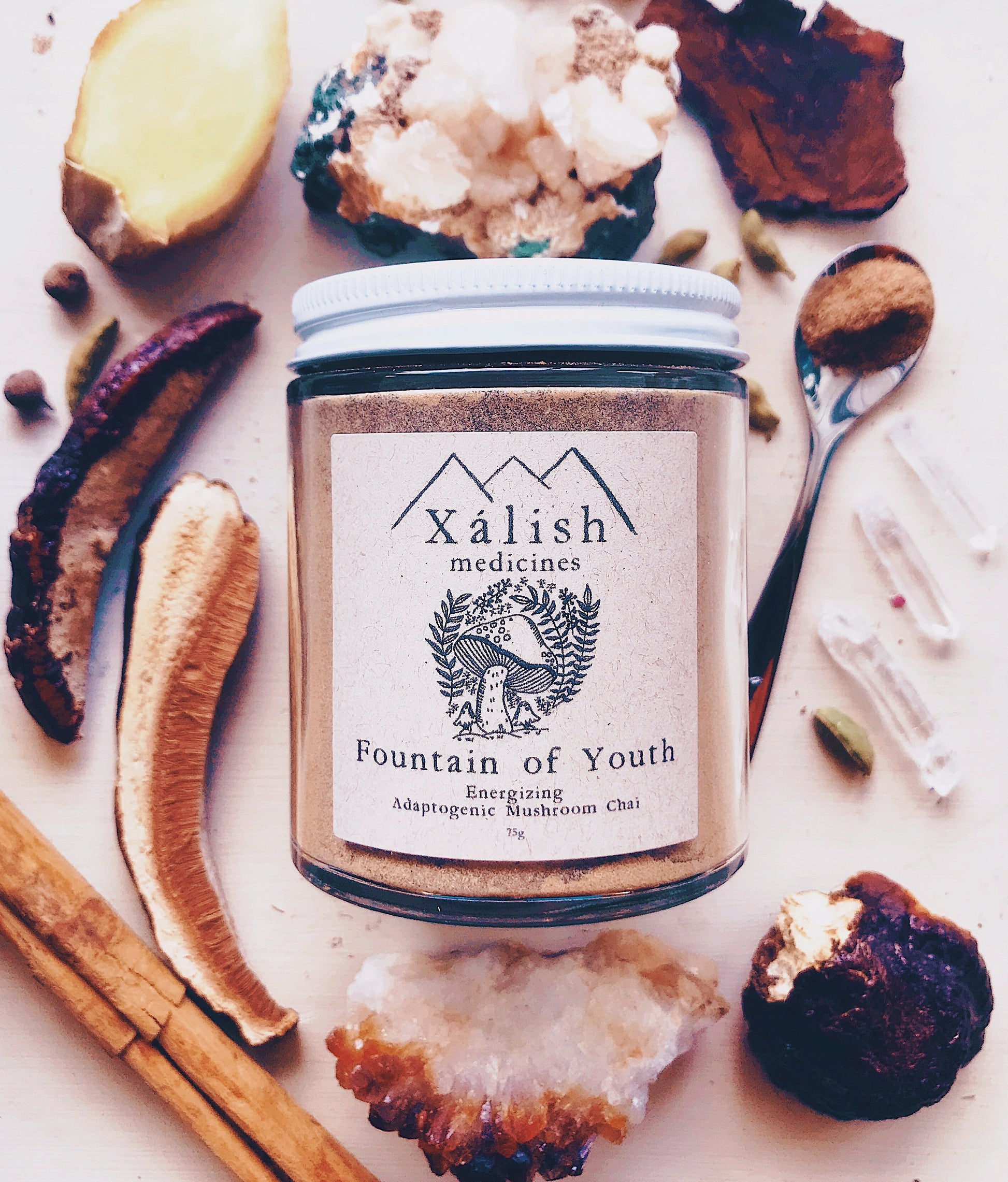 Fountain of Youth Adaptogenic Mushroom Chai is a potent Elixir made of Roots + Spice + Medicinal Mushrooms. For folks who are feeling tired, burnt out, worn down or who want to prevent this state.