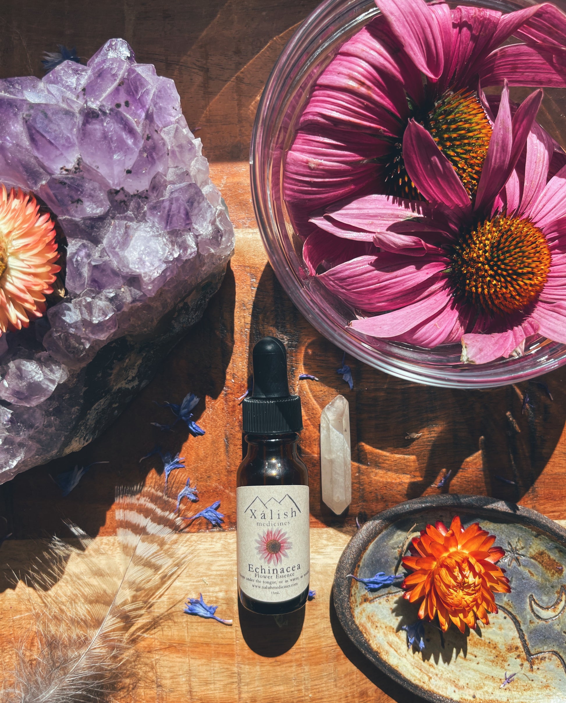 How to work with Echinacea Flower Essence: Flower Essences are an intuitive Medicine, and there are many ways to work with them. A starting place may be a few drops under the tongue, or in a glass of water. Taken 1-3 times a day, for a few days in a row. You can also add them to bath water, or to topical applications of creams + lotions (add to hands, not into another bottle directly).