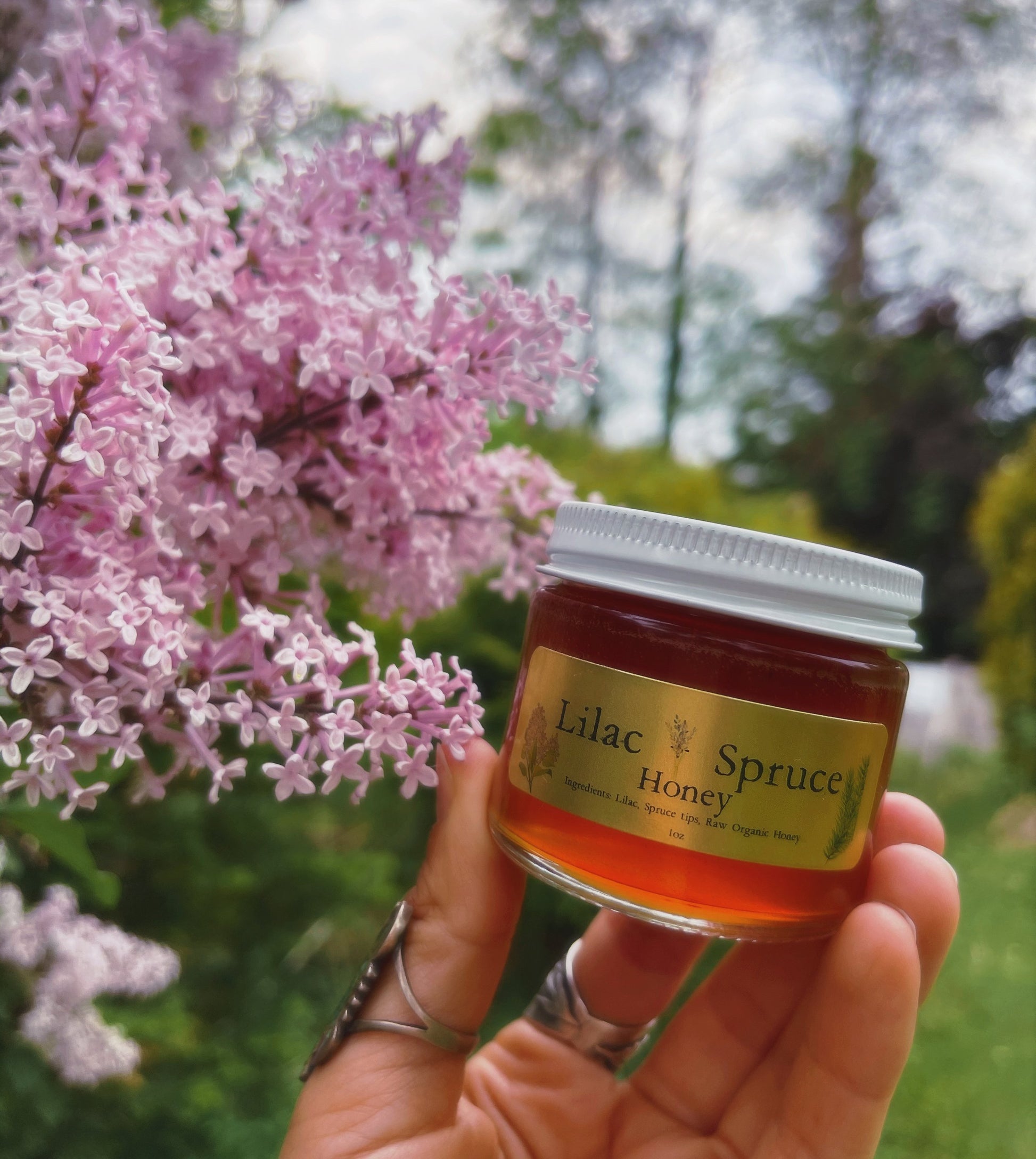 This honey has a subtle flavor, there is extra sweetness from the Lilac, though it isn’t overly floral. The Coastal Douglas Fir tips offer just a hint of citrus & evergreen Medicine taste. It is definitely a bit astringent, suggesting it may be helpful for healing tissues, tightening mucosa (think ulcers, leaky gut, womb/uterine healing, inflammation, etc). Fir tips are also high in Vitamin C & other immune supportive constituents.