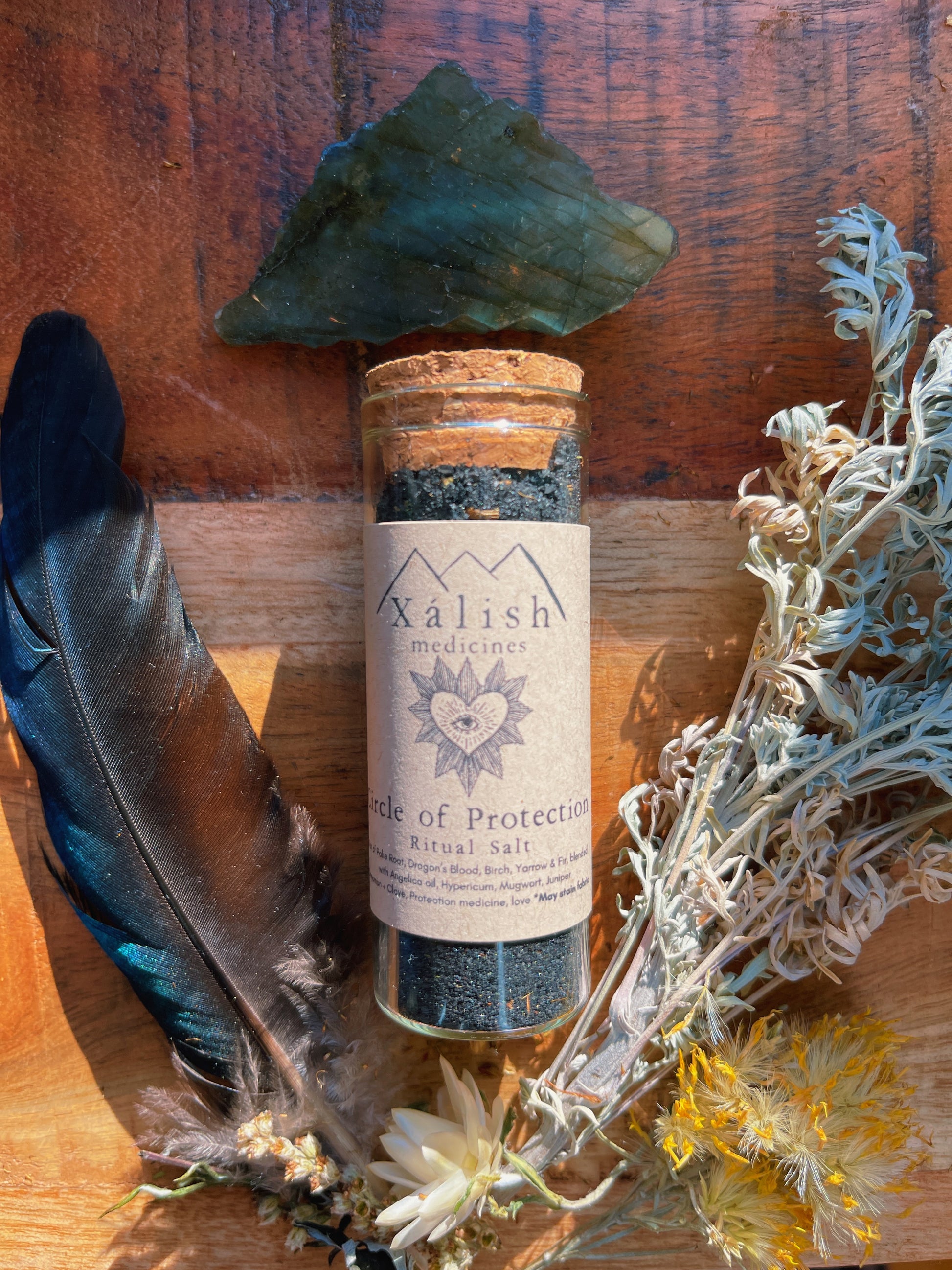 How to work with Circle of Protection Salts: You can work with Protection Salts in many ways, keeping in mind that they can stain fabrics, and a little goes a long way. Sprinkle around doors & windows to keep unwanted energies out, set a dish under the bed to absorb energies, and offer protection. Add ritual items into some Salt (ensuring it is ok for them to go in the salt), to clear energy & attune. Sprinkle a very small amount in floor cleaning bucket (like a tiny pinch) to clean. Keep in a tiny bottle or pouch with you for protection throughout the day/when going through something that requires more protection/clearing harmful energies.